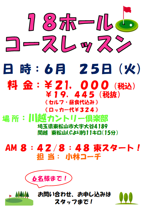 18Hコースレッスンのご案内【6月25日(火)川越カントリークラブ