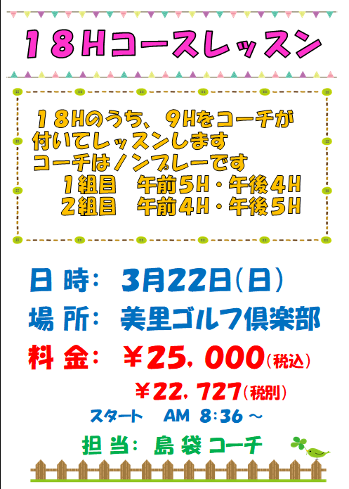 18Hコースレッスンのご案内【3月22日(日)美里ゴルフ倶楽部】