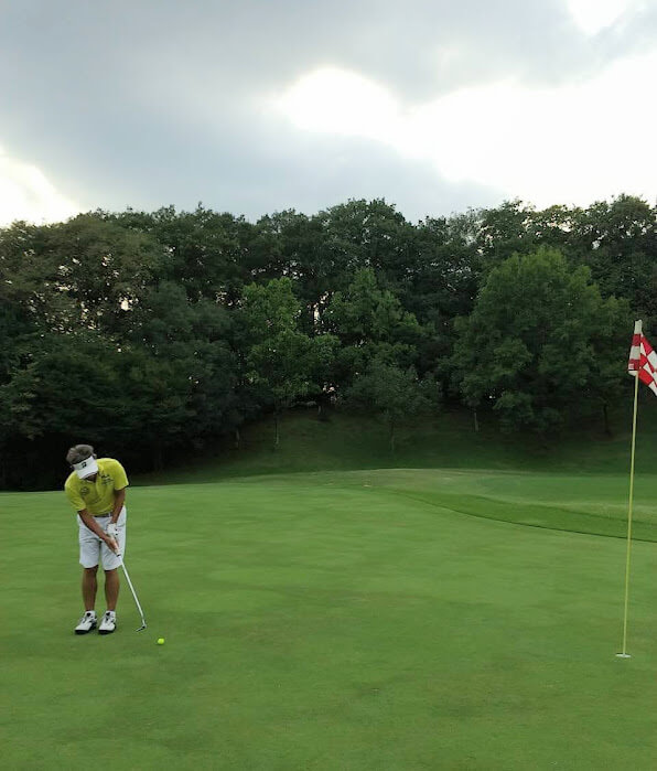 初めて参加のIさん、パッティングが悩みという事で、朝の練習グリーンでチェック。