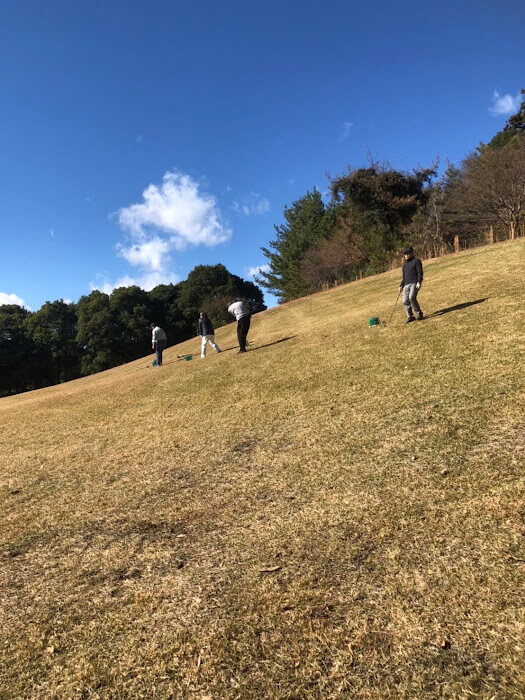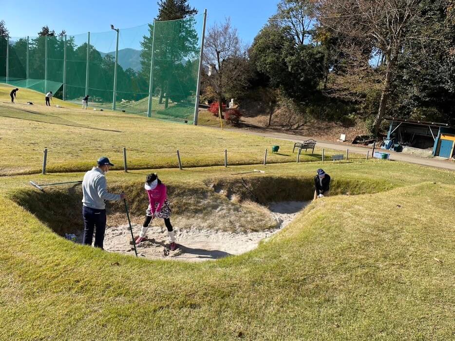 アプローチ練習場でバンカーなど傾斜の打ち方など練習します。